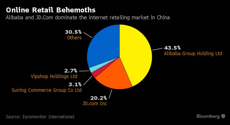 电商巨头线上零售市场占有率:阿里系43.5%、京东20.2%、苏宁3.1%、唯品会2.7%、其他30.5%
