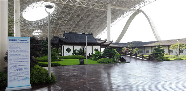屋顶的露天空中花园更是美不胜收,一草一木都别具特色。据导游介绍,“这是国内面积最大,功能最全,中国特色最浓的屋顶花园,是一个园林迷你版的西湖。”