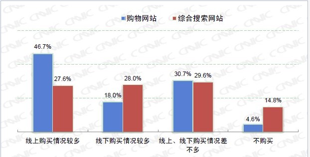 与此同时,网民在手机端购物搜索后的转化率略低于电脑端。但值得注意的是,手机购物搜索后,线下购买情况较多的用户比例高于电脑端,说明手机购物搜索与网民线下购物行为联系更为紧密,用户在线下购物过程中可通过手机随时查找产品信息。
