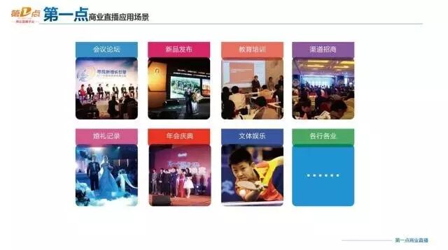 除此之外,第一点还提供会议论坛、新品发布、教育培训、渠道招商、婚礼记录、年会庆典、文体娱乐等场景直播。